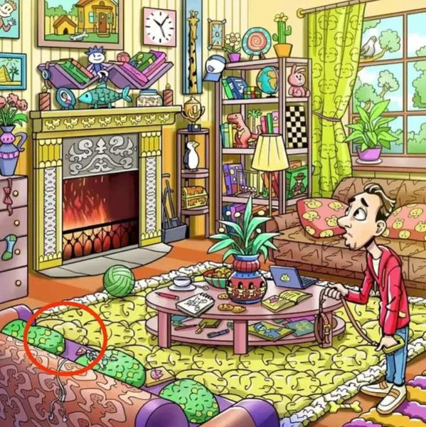 L’image représente un salon vivant, rempli d’objets familiers : canapés, plantes vertes, jouets éparpillés, une cheminée, une table basse surchargée… Tout y est pour capter l’attention. Mais parmi ce tumulte visuel, un chien se cache en toute discrétion, bien décidé à retarder sa promenade. Et c’est là que les choses se compliquent.