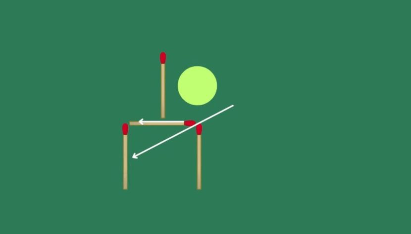 L’image de départ est claire : quatre allumettes disposées de façon à représenter une raquette, avec une petite balle “coincée” à l’intérieur. Votre mission est de faire sortir cette balle… mais sans la toucher directement, et en ne déplaçant que deux allumettes.